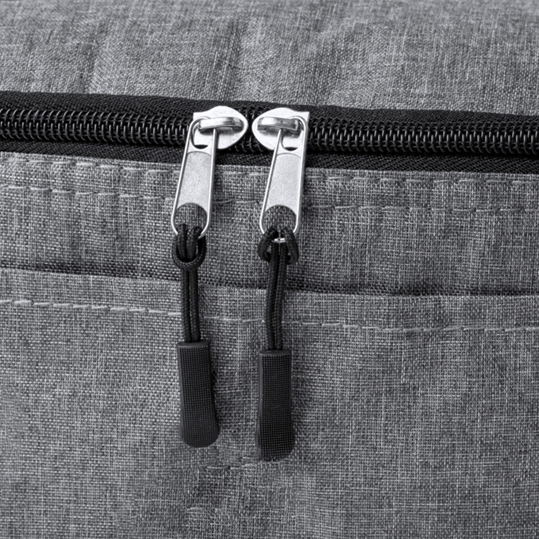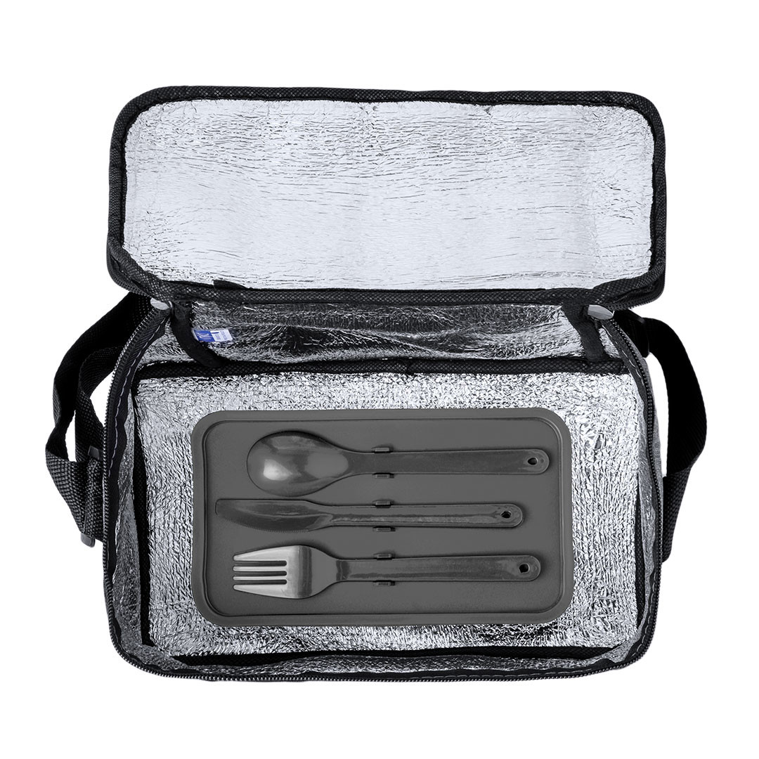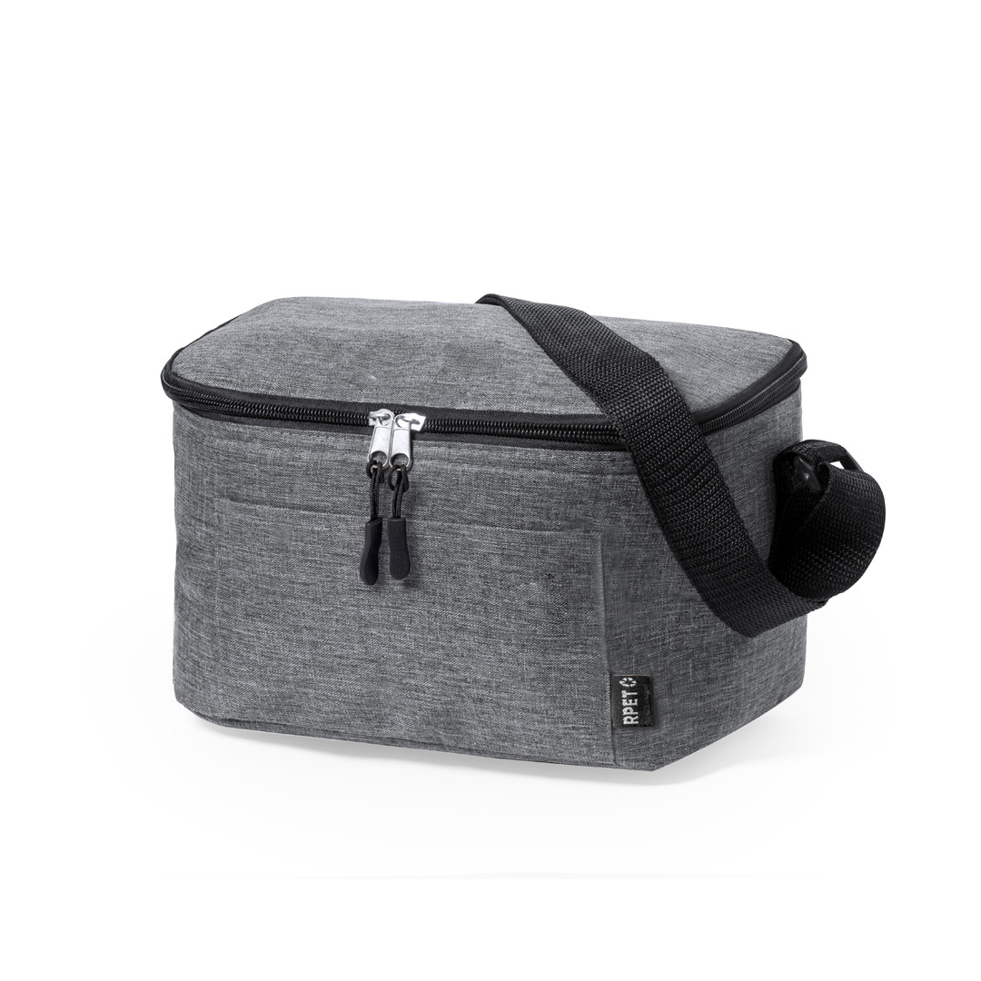 Nevera confeccionada en resistente poliéster 600D RPET con un atractivo efecto melange. Su compartimento principal cuenta con cierre de cremallera y forro interior de aluminio. Además, incorpora un práctico bolsillo exterior y una cinta bandolera ajustable, destacando el logotipo RPET en la etiqueta exterior. Incluye fiambrera con dos compartimentos de 700 ml y cubiertos fabricados en PP reciclado de color negro. Presentado de manera individual en una bolsa reciclada.El material RPET se elabora a partir de plástico reciclado, para así fomentar la reutilización de residuos plásticos y ayudar a la sostenibilidad del planeta. Fiambrera PP Reciclado, 2 Compartimentos 700 ml Incluida