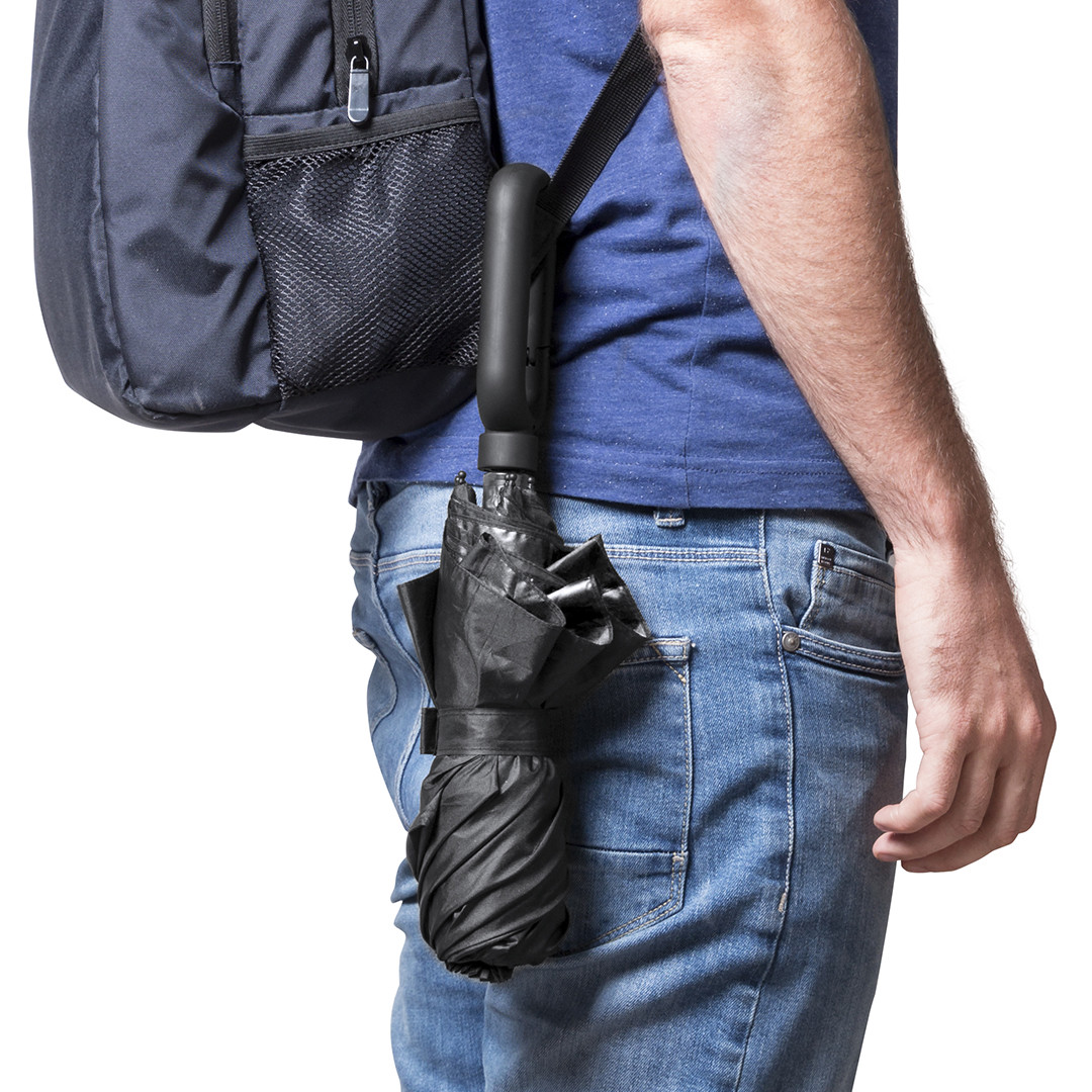 Paraguas plegable de alta calidad de 8 paneles en sobrios colores. De 98cm de diámetro, con apertura automática y en resistente material pongee. Con varillas metálicas en color negro, cierre de velcro y mango ergonómico de EVA con cinta de transporte. Presentado en funda individual a juego con cinta de transporte y cierre con accesorio de ajuste. 21". Automático. Mango Ergonómico EVA. Funda Pongee