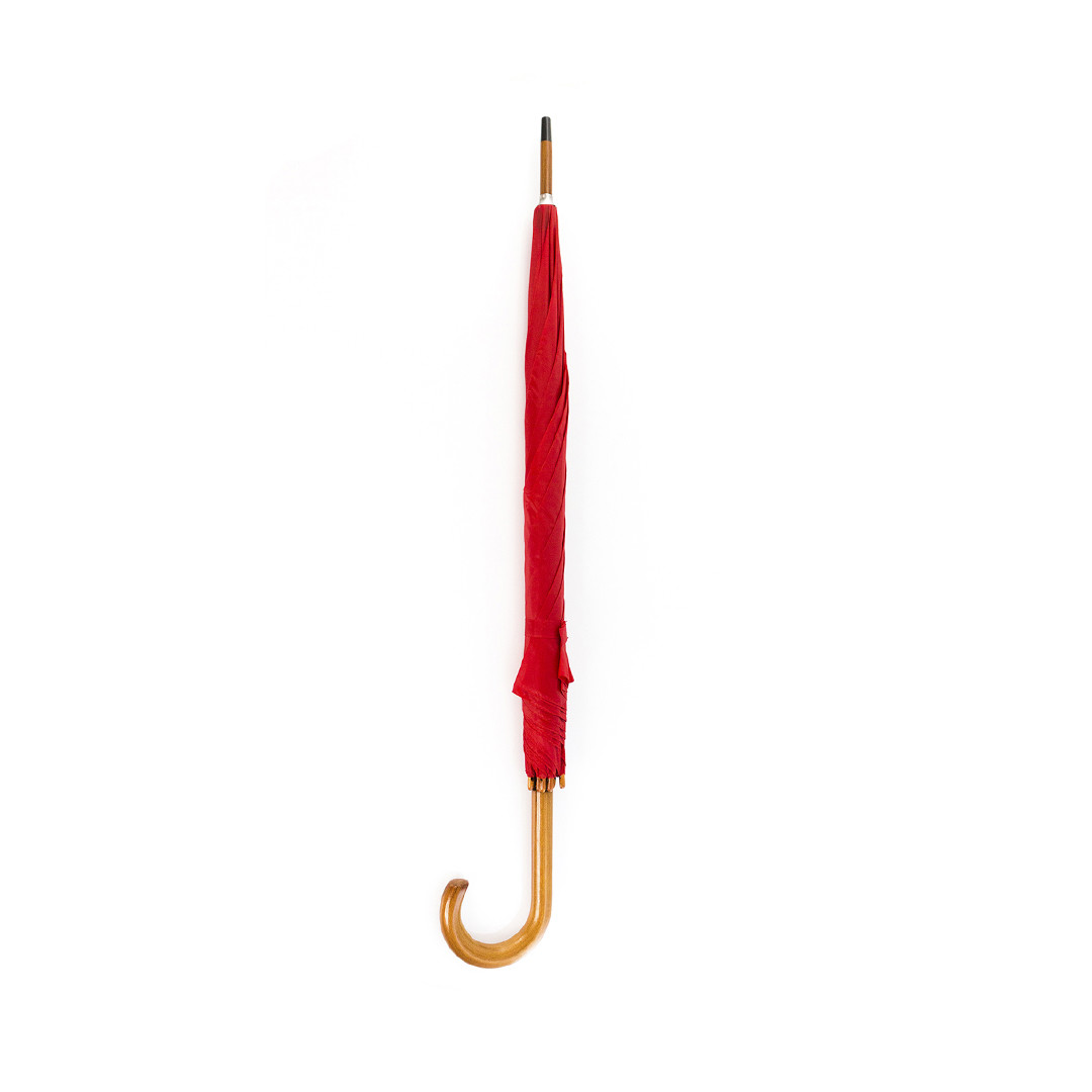 Paraguas de 8 paneles confeccionado en poliéster. De 105cm de diámetro, con apertura manual, varillas metálicas en color negro y cierre de velcro. Palo y mango fabricados en suave madera de color natural, con tela en variada gama de vivos colores. 23". Mango y Caña Madera