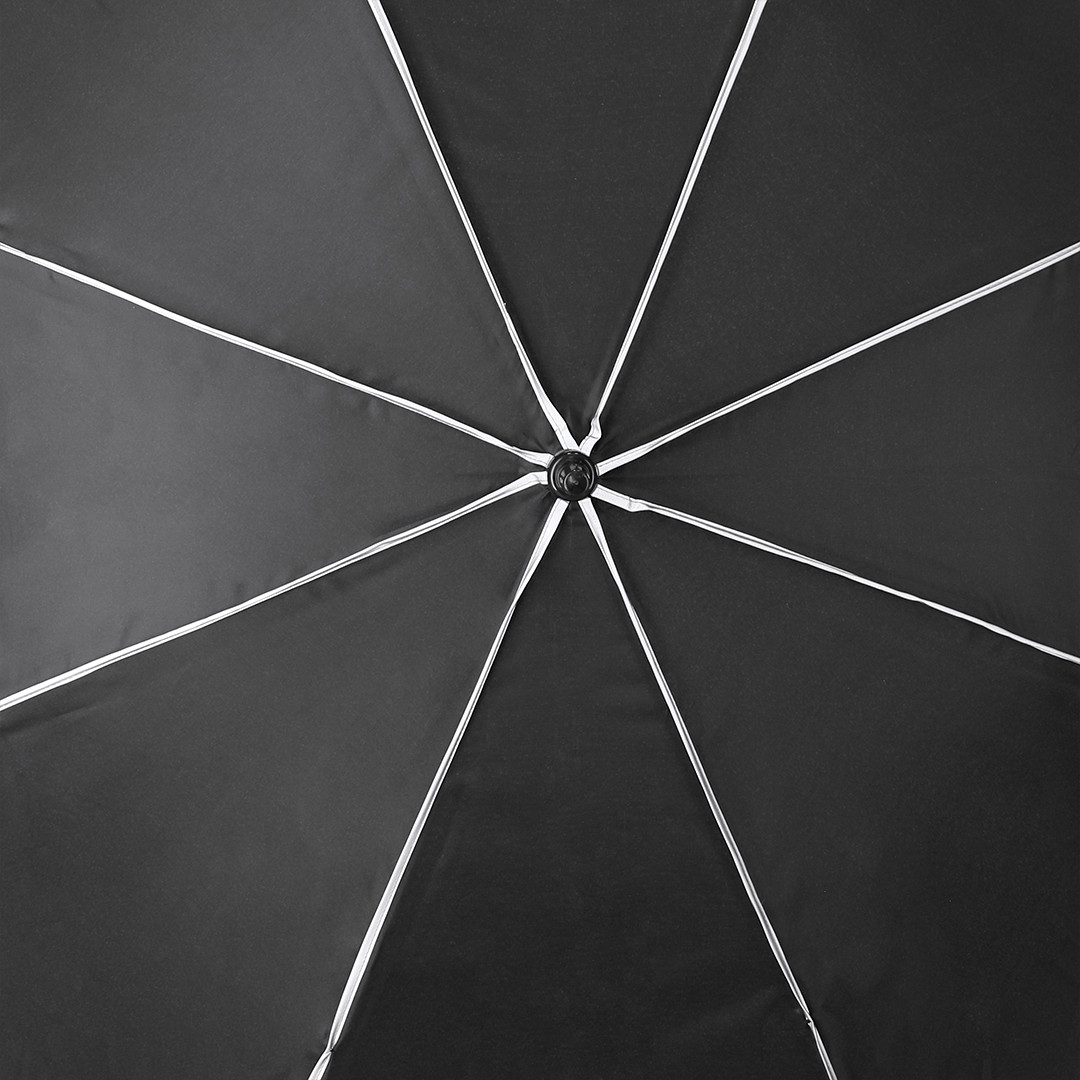 Paraguas antiviento fabricado en RPET 190T de 8 paneles, con elegante diseño en color negro con ribetes reflectantes. De 120cm de diámetro, con apertura automática y en resistente material pongee. Con varillas en fibra de vidrio en color negro, cierre de velcro y mango en PP. Incluye funda con correa ajustable para fácil transporte y distintiva etiqueta RPET. 27". Automático. Sistema Antiviento. Reflectante. Funda Pongee RPET