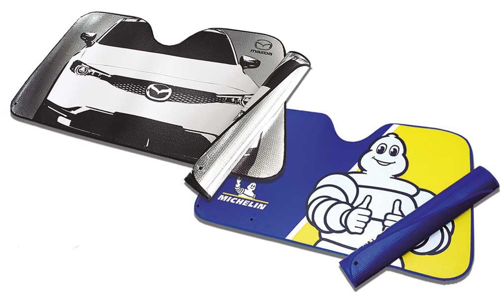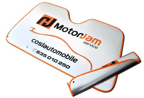 Parasol para coche, fabricado en aluminio de burbujas de 6 capas, son muy resistentes, protege los componentes del interior del vehículo, como los asientos, volante y elementos electrónicos. Se pueden personalizar en serigrafia, en impresión digital: mínimo 150 uds y en flexografía: mínimo 1000 uds. De tamaño 130 x 70 cm, 120 x 60 cm