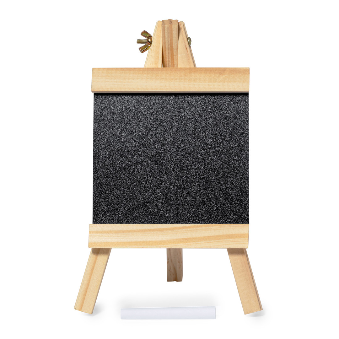 Original atril con pizarra hecha en madera, con tiza incluida. Presentado individualmente en caja de diseño kraft. Tiza Incluída