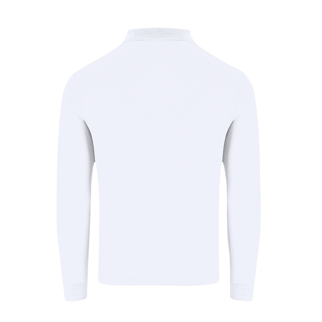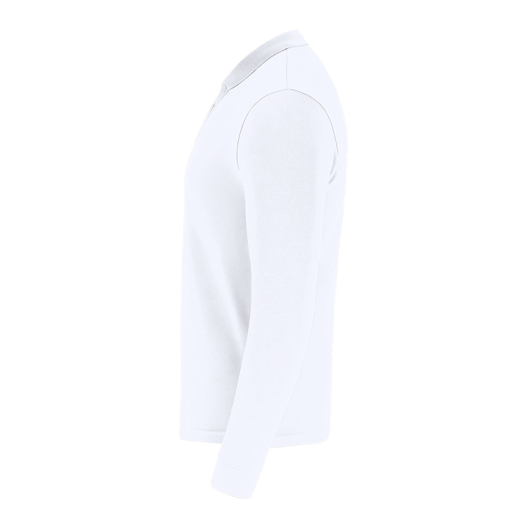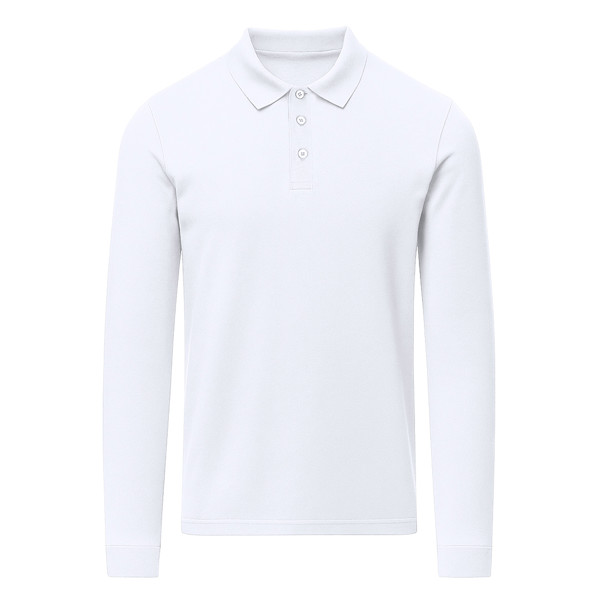 Polo unisex de manga larga confeccionado en tejido piqué. Cuello y puños en punto elástico 1x1 con elastano para un mejor ajuste y confort. Tapeta de tres botones a tono y cubrecosturas reforzado en cuello.