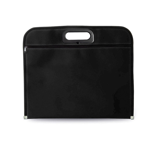 Portadocumentos con solapa de cierre de velcro en resistente non-woven con elegante ribete en color negro. Con compartimentos interiores para bolígrafos.