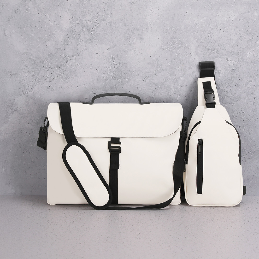 Portadocumentos con solapa de cierre de velcro en poliéster 600D con elegante tira frontal en color negro. Con asas de transporte reforzadas y cinta bandolera ajustable. Compartimentos interiores para bolígrafos y funda para smartphone en PVC con función táctil.