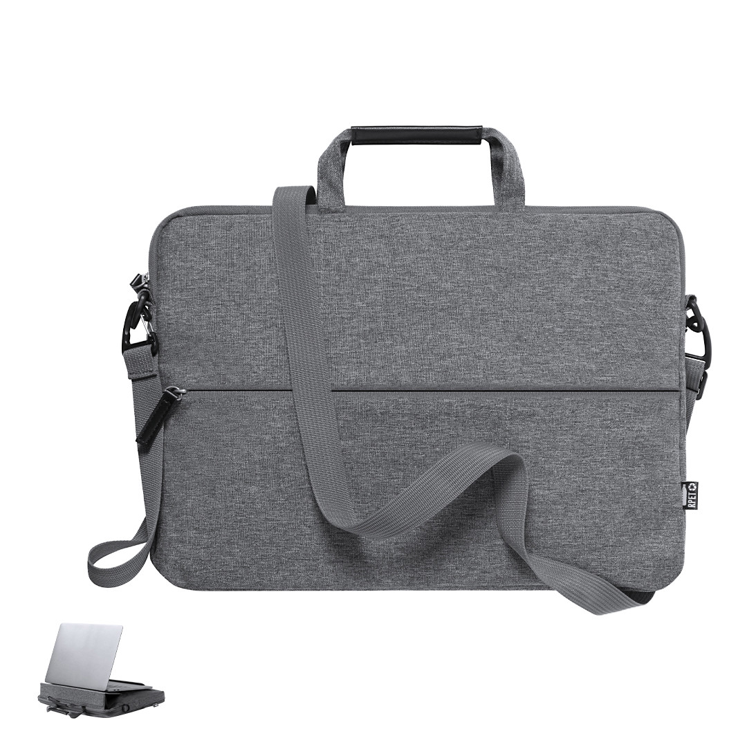 Portadocumentos de línea nature y en resistente 300D RPET efecto melange, elaborado a partir de plástico reciclado, para así fomentar la reutilización de residuos plásticos y contribuir a la sostenibilidad del planeta. Con original soporte integrado para ordenador portátil, bolsillos principal y frontal con cierre de cremallera. Interior con bolsillo acolchado para portátil de hasta 15 pulgadas y bolsillo para tablet de hasta 10 pulgadas. Cinta bandolera ajustable para hombro, con asa de transporte reforzada. Resistencia hasta 6kg, con distintivo RPET en etiqueta exterior. Acolchado. Bolsillo Acolchado para Portátil