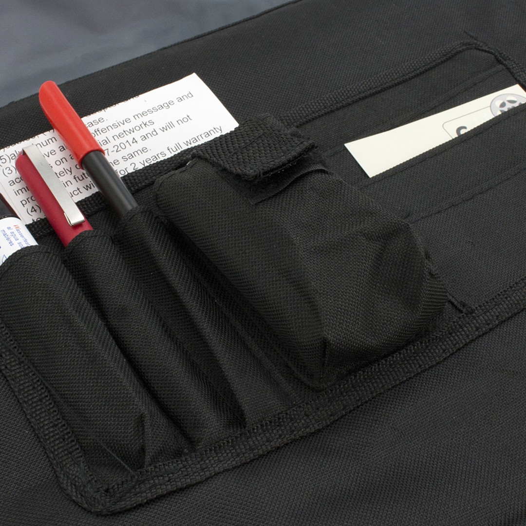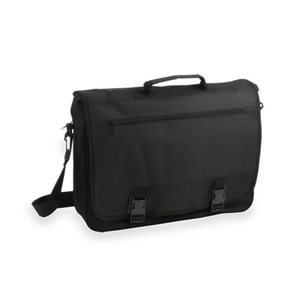 Portadocumentos con solapa de cierre de velcro en resistente non-woven con elegante ribete en color negro. Con compartimentos interiores para bolígrafos.