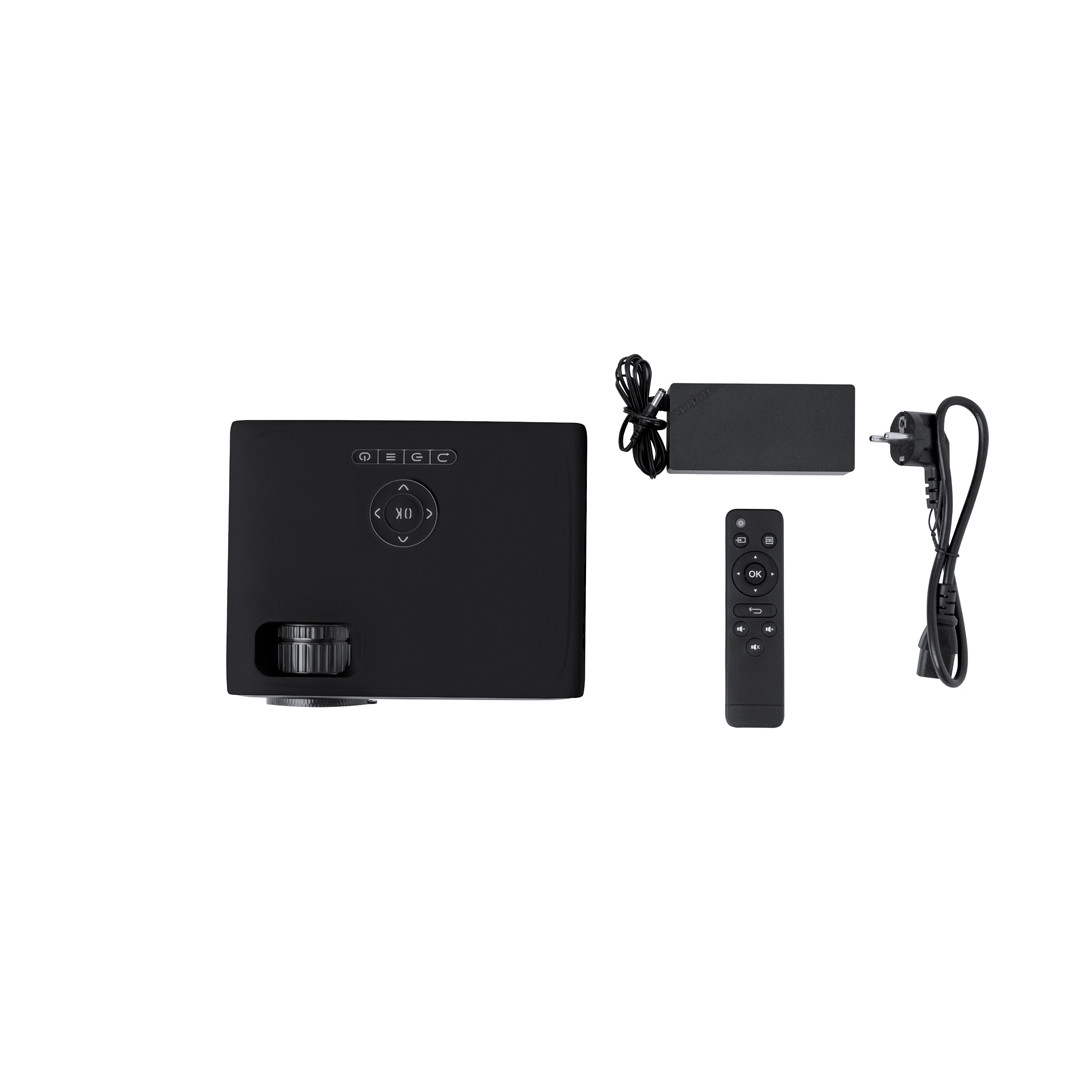Proyector con conectividad bluetooth y WiFi que proporciona una fantástica experiencia audiovisual. Fabricado en resistente ABS de color negro, con regulador de enfoque y ángulo para un óptimo visionado. Saca una potencia de 7.000 lúmenes, con resolución 720p, e incorpora un potente altavoz de 5W. Además, cuenta con multitud de conexiones: 3xHDMI (1 conector macho + 2 conectores hembra), conexión USB, salida de audio jack de 3,5 mm y entrada de audio jack de 3,5 mm. Con ranura para tarjetas de memoria Micro SD y mando a distancia para un cómodo y fácil manejo del dispositivo. Incluye cable de alimentación CA 220V-240V y viene presentado en caja de diseño kraft. 720P. Wifi. Conexión Bluetooth. Potencia Sonido 5W. 7000 Lúmenes. CA 220-240V