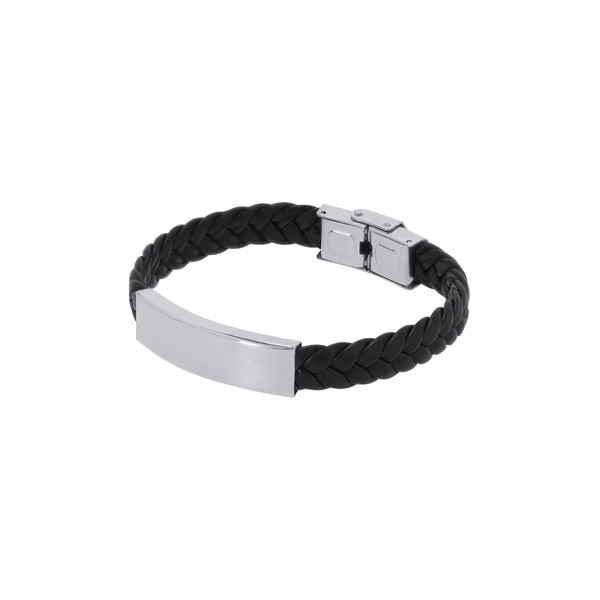 Pulsera de piel sintética negra adornada con placa fabricada en acero inox pulido de diseño plano. Cuenta con un original cierre de seguridad.