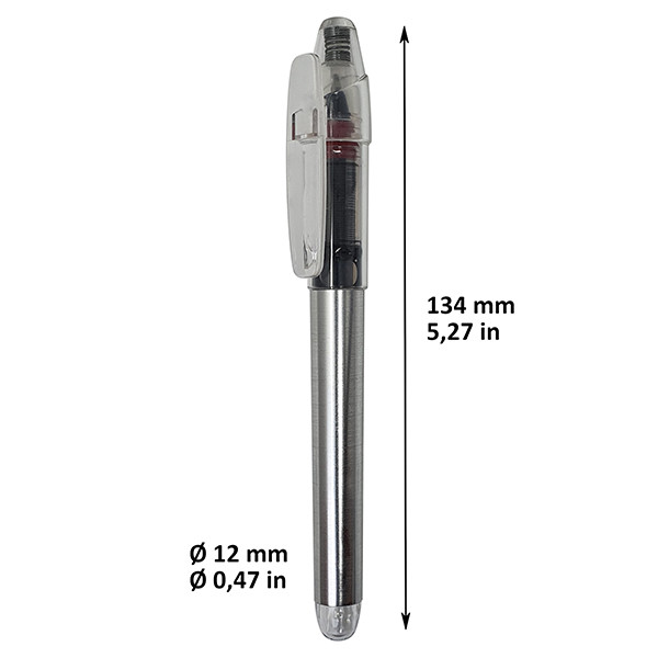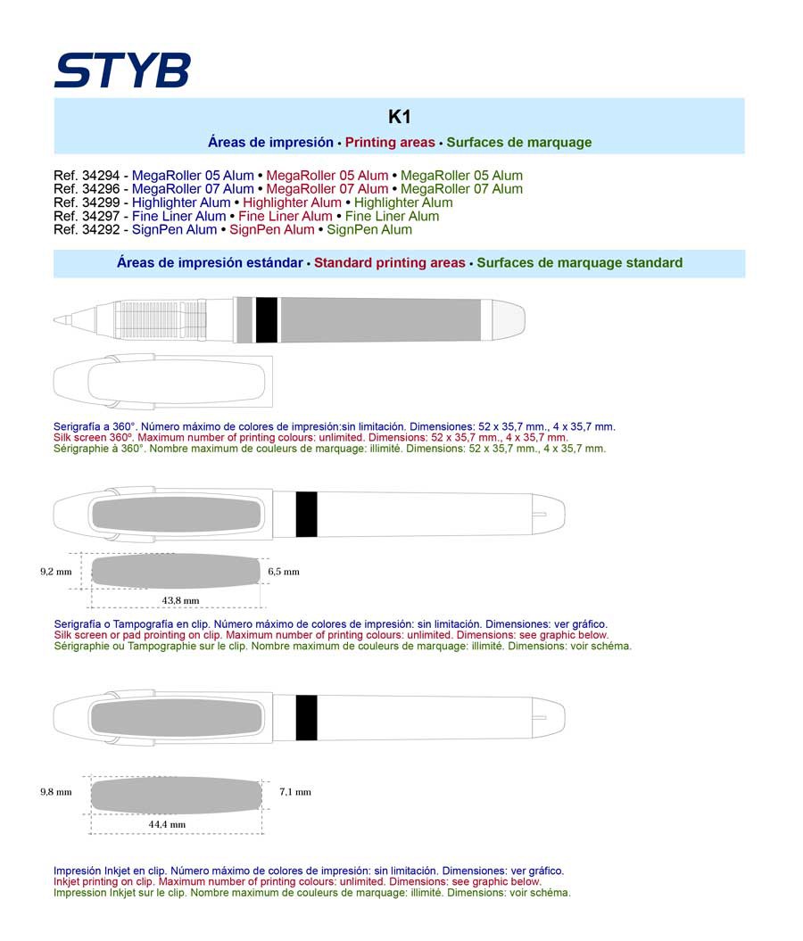 Roller de tinta líquida. Amplia área de impresión publicitaria en cuerpo y clip. Escritura suave, continua y duradera. Punta de acero inoxidable y bola de carburo de tungsteno. Diámetro de bola 0,5 mm. Cuerpo con acabado aluminio y apliques en colores vistosos. Fabricado en España. Tinta azul. Impresión incluida con serigrafia circular 360º a un color en el cuerpo del bolígrafo
