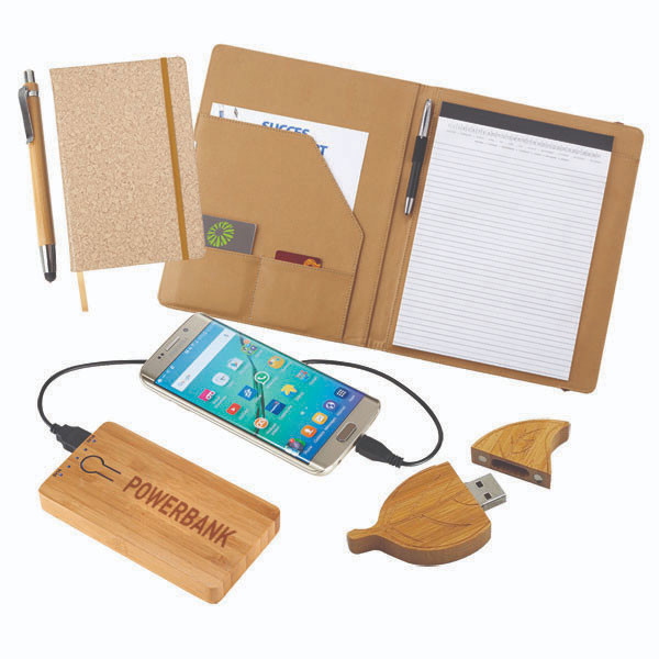 Idea de set ecológico esta compuesta de carpeta, memoria usb, powerbank, libreta Moleskine y bolígrafo, pudiéndose personalizar cada uno de los objetos.