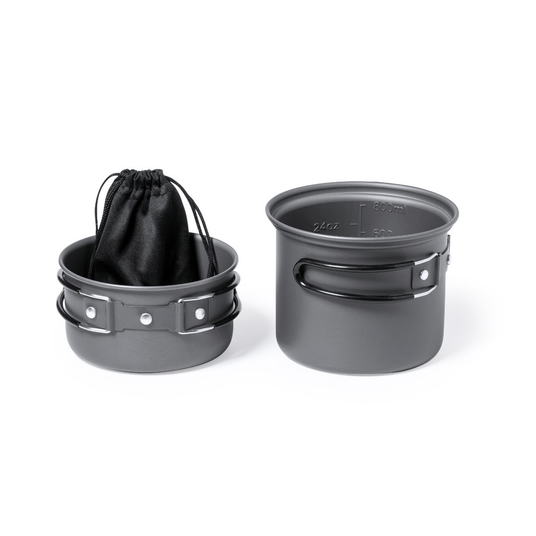 Completo set de menaje para camping de tamaño ultra compacto. Presentado en resistente funda de RPET con cierre de cordón, accesorio de ajuste y etiqueta exterior con distintivo RPET. Contenido:1 olla de aluminio acabado gris mate. 800 ml de capacidad 13 cm de diámetro x 10 cm de alto. Asas plegables con protección antiquemaduras.1 olla de aluminio acabado gris mate. 600 ml de capacidad 12 cm de diámetro x 6,5 cm de alto. Asas plegables con protección antiquemaduras.Cuchara, cuchillo y tenedor plegables fabricados en acero inox. Con mango troquelado y cierres de seguridad. Presentados en funda individual de RPET con cordones de cierre. El material RPET de las fundas se elabora a partir de plástico reciclado, para así fomentar la reutilización de residuos plásticos y ayudar a la sostenibilidad del planeta. 5 Accesorios. Funda Poliéster RPET