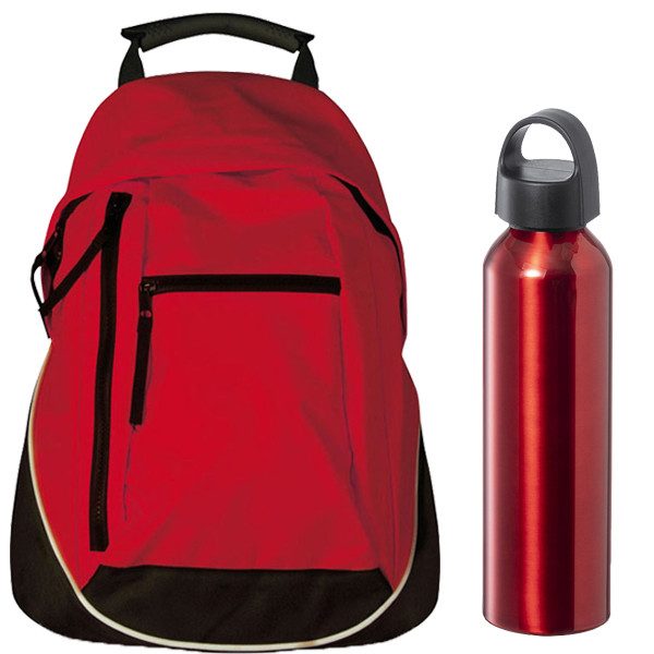 Sets para congresos deportivos formado por mochila y bidón personalizado. Se puede escoger en diferentes colores. Consultar otros kits que además incluyan lanyards, memorias USB, etc