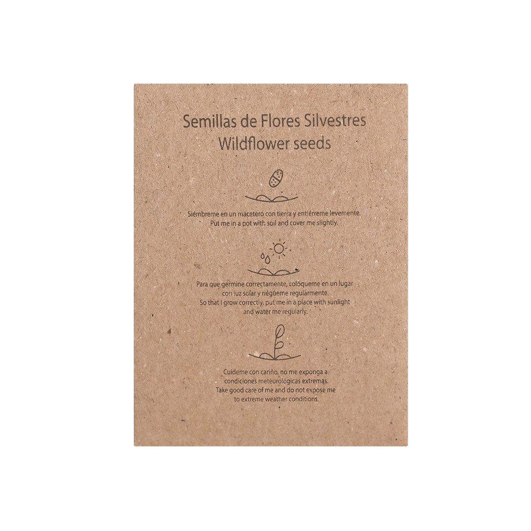 Sobre de papel kraft que contiene una mezcla de semillas de flores silvestres, ideal como obsequio ecológico, permitiendo la siembra directa. Flores de Abeja
