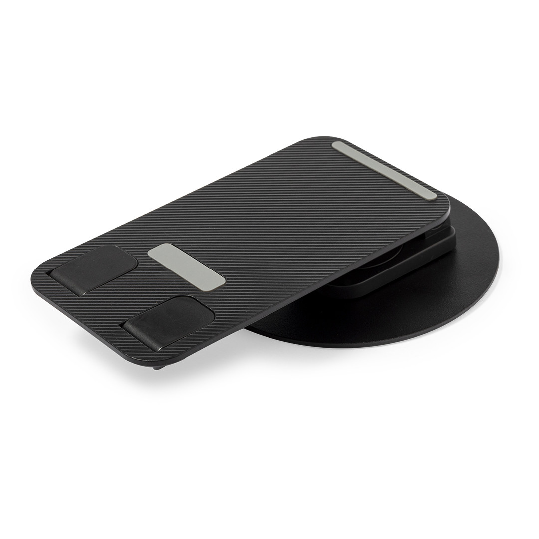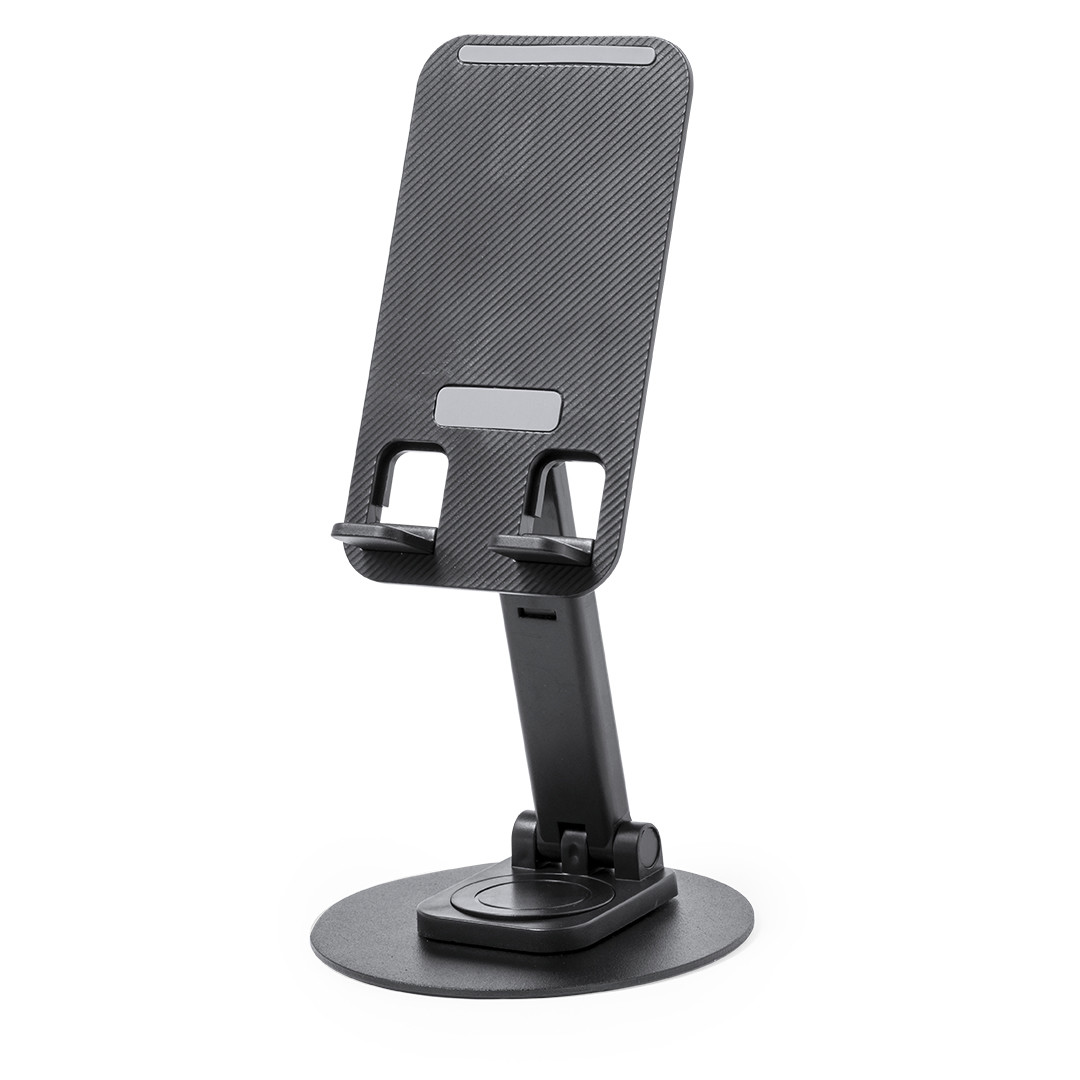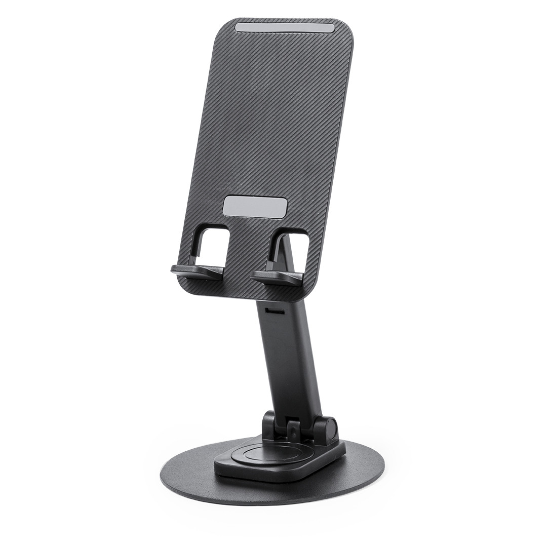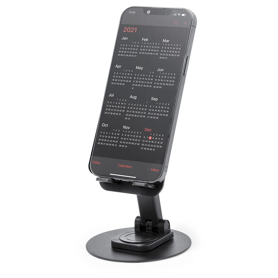 Soporte plegable para smartphone y tablet, fabricado en resistente aluminio y ABS. Regulable en altura, con almohadillas de goma antideslizantes en base y soporte. En sobrio acabado de color blanco o negro, y con amplia superficie de marcaje. Presentado en atractiva caja de diseño. Plegable. Ángulo Regulable