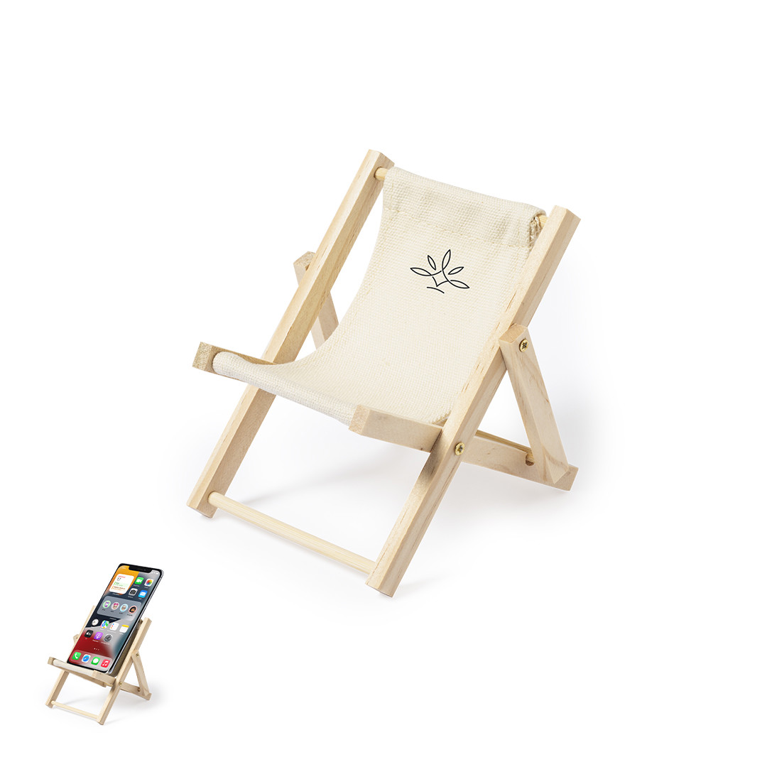 Original soporte para smartphone plegable, con estructura fabricada en madera y tela en 100% algodón de acabado natural. Plegable. 2 Posiciones